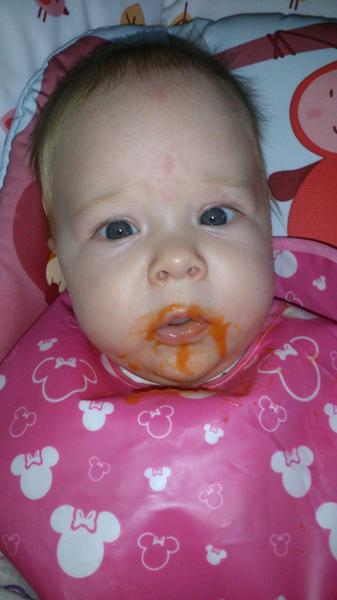 Ano na to si moc dobře pamatuju :D dostala lžičku mrkve a hrozně mi chtěla zrovna něco povídat a začala dělat takové to brrrr :D no asi víte jak to dopadlo, poprskáno všude kolem a hlavně na mém obličeji :D