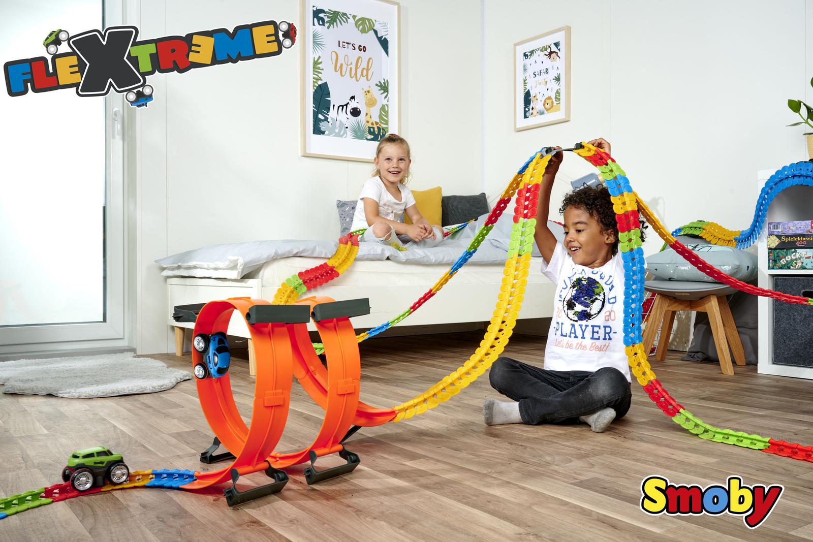FleXtreme je zcela nový herní svět, který nijak neomezuje dětskou kreativitu! Pomocí flexibilních kolejnic mohou děti sestavovat nejbláznivější závodní dráhy a dělat neuvěřitelné kousky na ještě neuvěřitelnějších cestách s výkonnými závodními vozy Flextreme díky senzačním sklonům, smyčkám, spirálám a bláznivým svahům. Startovací sada Flextreme je ideální pro začátek v rychlém světě Smoby Flextreme.