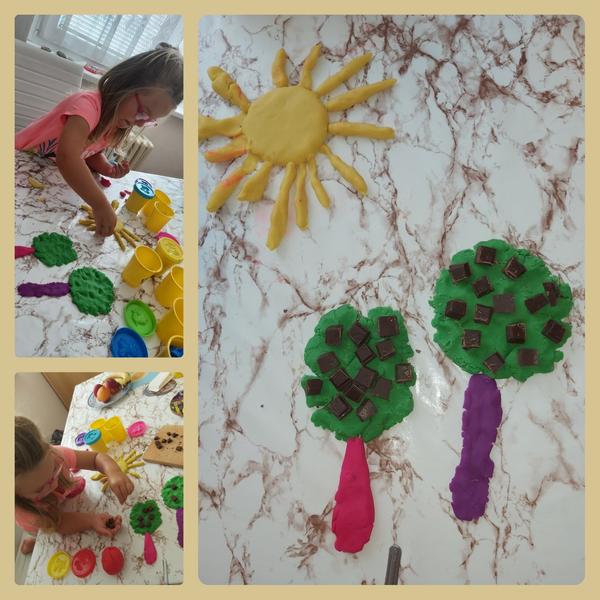 Jak si predstavujes tu pravou cokoladovou tovarnu? jsem polozila 3,5 lete dcerce a rekla mi, ze takova tovarna se urcite skryva v hlubokem lese, kde rostou na stromech same cokoladky. Skritci je v noci sbiraji a ve dne v tovarne bali detem do balicku 🙂)) .... 2 cokostromy jsme spolu vymedelovaly a mamka se pokusila jeste trochu zabasnit ;)