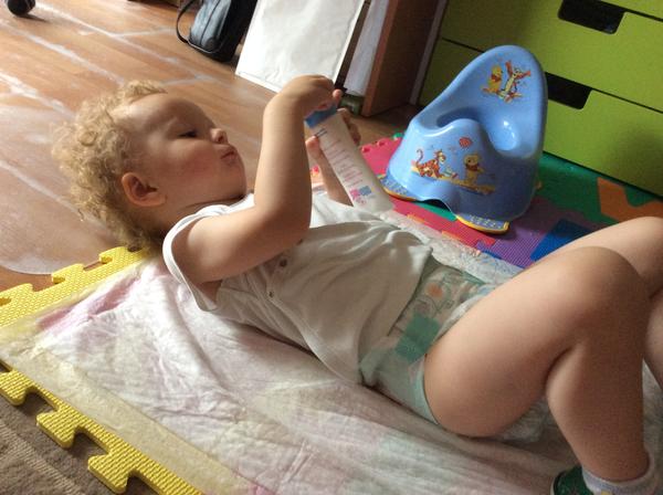 Vetsinou staci ubrousek nebo tuba kremu a mrnous se zabavi. A k tomu rikanka Bezela myska okolo briska. Z toho je drobek uplne na vetvi 🙂