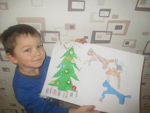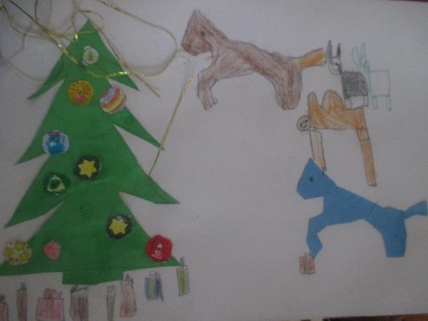 taky posíláme Davídkovo dílko do soutěže. Nejdřív si nakreslil a vystřihl modrého koníka a stromeček, pak jej ozdobil a poté už dokresloval vše potřebné. Dárečky a zbytek rodinky od koníku, u nás nechybí ani velbloud. Když jsem se ptala proč nakreslil velbouda, tak prý, že o vánocích nesmí velboud chybět. Tak mi ti tři koníci s velbloudem připadají jak Tři králové co nesou dary, tady si ale koníci pro dárky jdou.