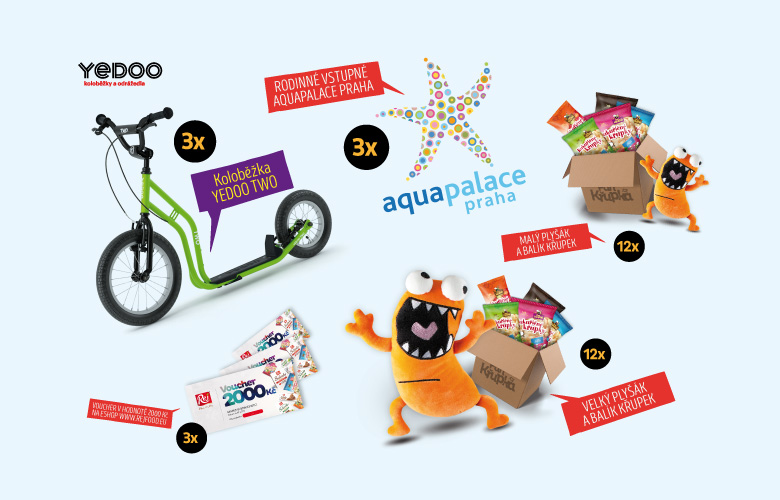 Léto je tady a s ním i velká soutěž pana Křupky, ve které můžete vyhrát koloběžky Yedoo, celodenní rodinné vstupné do Aquapalace Praha, vouchery na nákup v eshopu rejfood.cz nebo velké balíčky s originálním plyšákem a pořádnou zásobou oblíbených křupek.