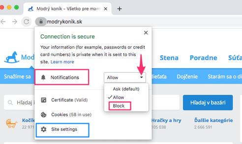 3. Otevře se ti tato nabídka. Dole máš možnost vybrat Allow (Povolit) nebo Block (Blokovat). Vyber Block (Blokovat) a upozornění z Modrého koníka ti v prohlížeči už nebudou chodit. Volba se nikde nepotvrzuje, co vybereš, platí:
