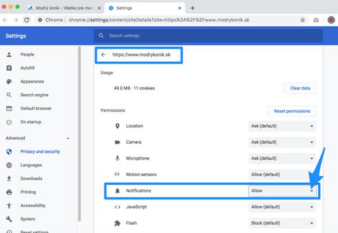 3. Jinak klikni dole na Site settings (Nastavení webu) a otevře se ti tato nabídka. Zkontroluj, že nastavuješ stránku www.modrykonik.cz a najdi Notifications (Oznámení). Vpravo máš možnost vybrat Allow (Povolit) nebo Block (Blokovat):