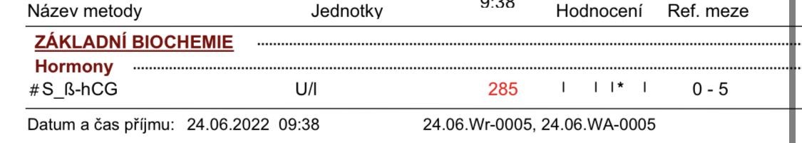 hCG se uvádí buď mIU/ml nebo v IU/l, čili výsledek je identický. Norma pro normálního pacienta je 0-5IU/l. Ty máš 285 mIU/ml nebo IU/l. Ta hvězdička označuje normu, mezi 0-5. Samozřejmě si nejpravděpodobněji těhotná, jen pro úplnost: hcg může mít pozitivní i chlap při přítomnosti nádoru, který hcg produkuje.