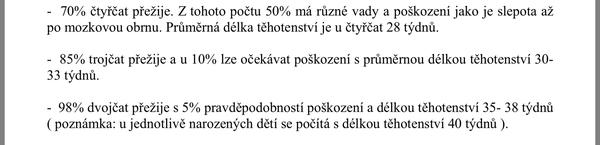 @oveckaluky 98% prezije s 5% pravdepodobnosti poskozeni. A jeste hrozi porod uz v 35.tt,kdy se hmotnost dvojcat pohybuje nekde okolo 2000g. Tohle vsechno je o dost vetsi riziko!