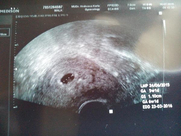Když jsem zjistila, že jsem těhu, tak jsem byla hned druhý den u gyn a byla jsem 5+2tt - t.č. byl vidět jen gestační váček(dutinka) bez žloutkového váčku. O tři týdny později v 8+2tt již bylo vidět tepající srdíčko.