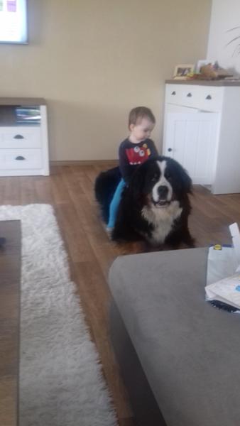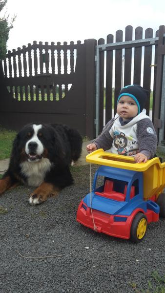 Když se narodil první syn, měli jsme půlroční štěně berňáka 🙂 a celá rodina se děsila, že tak velkého psa pustíme k miminku. U kočárku se naučil chodit během několika procházek, v zimě jsme kvůli sněhu měli nosítko. Jak postupně oba rostli a pobírali rozum, tak se z nich stala skvělá dvojka. Pes se naučil hlídat kočárek před obchodem, na zahradě a dneska malého "hlídá" i na pískovišti. Takže vůbec nemějte obavy, pes se všechno naučí a pochopí. Syn po něm neustále leze, lehá si na něja on si nechá vše líbit. Teď čekáme druhého syna a pes se už teď chodí mazlit k břichu 🙂