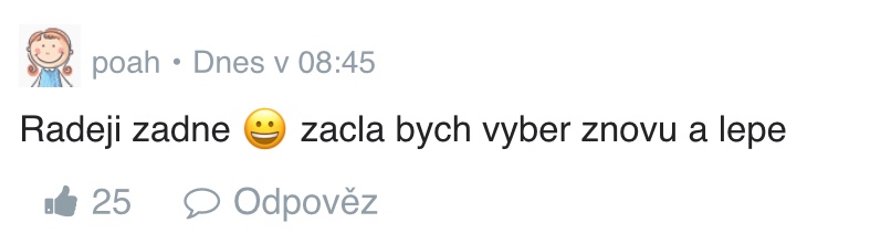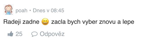 @jasminca tak jsi nemela zakladat diskuzi, kdyz ti nektere komentare nesedi. Ja nevidim duvod, proc se mam zdrzovat svych komentaru, jsem slusna, vyjadruji se naprosto jasne a v souladu s pravidly. Nikoho vulgarne neurazim ani neprovokuju. Mam pravo komentovat i tebou zalozenou diskuzi. S tim se holt budes muset smirit. I kdyz vlastne...uz ti k tomu nemam vlastne co dalsiho rict. Snad jen at vyberes nejen ke sve spokojenosti, ale i ke spokojenosti ditete. Jo a tykame si tady, ne?