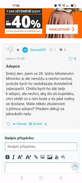Ahoj, jsme mladý, pracující a zajištěny pár, manželé, před časem jsme si řekli, že koupíme dům, aby jsme měli kam přivézt rodinu, chtěli jsme do svého. Mít vše jak se patří. Bohužel nemám ja dokonale své tělo a nemůžu otěhotnět. Podstoupili jsme několik inseminaci a IVF, bohužel doposud vše negativní. Jelikož rodinu chceme, tak již volíme i cestu přímé adopce. Pokud je zde maminka, která ví, že se o děťátko nemůže postarat a chtěla by zvolit tuto cestu, ať mě prosím kontaktuje na mail cina123@seznam.cz a můžeme se třeba domluvit. Pěkný den všem.