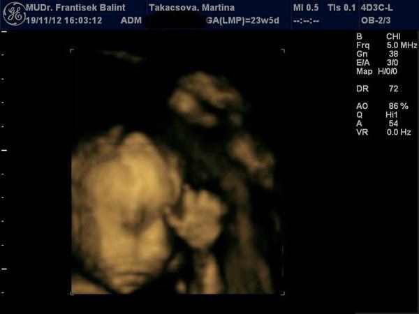 Ahojte kočky. Idem sa s vami podeliť. Včera som absolvovala 3D/4D ultrazvuk. Som veľmi šťastná lebo sa ukázalo, že čakáme zdravú princezničku 😵 Malinká sa moc nechcela ukázať a bolo jasné, že sa jej ultrazvuk nepáčil, čo je vidno aj na fotke. Bol so mnou aj manžel, bol to krásny pocit spolu pozorovať ako sa malinká vrtí 🙂