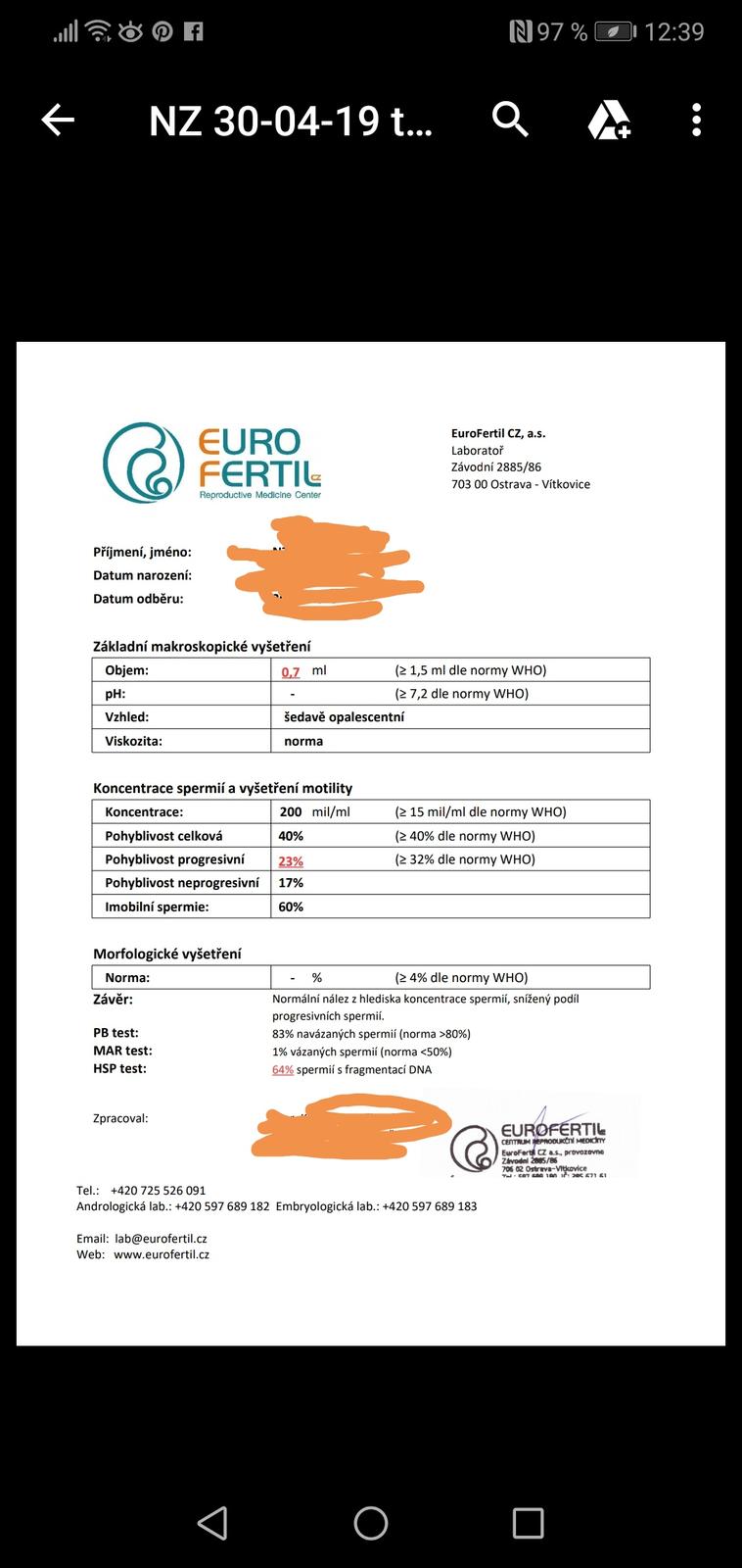 Pokud spermie jsou, tak to je to nejdůležitější. Kdyby byly neprůchodné cesty a spermie se do ejakulátu nedostaly, tak to pak máte šanci 0. K početí potřebujete 1 zdravou spermii a jedno zdravé vajíčko ;) Ať muž zobe Fertilan a snaží se trochu upravit životosprávu. Výsledky spermiogramu se mění den ode dne. Tento výsledek vlastně ukazuje, jak na tom bylo mužovo zdraví PŘED TŘEMI MĚSÍCI!! 😨 Spermie zrají 72 dní 👍