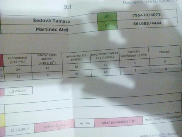 Ahoj holky 🙂, právě na internetu prohledávám úspěšnost IUI a narazila jsem na tuto diskuzi. Teď 1.12. jsem byla na 1. IUI a pocity jsou takové smíšené, samozřejmě moc doufám, že se zadařilo, ale zároveň mě odrazuje většina negativních výsledků, co tu čtu, no uvidíme 🙂. S manželem se o miminko snažíme skoro 3 roky, po roce a půl se zadařilo, ale cca v 7 tt zamlklo. Od té doby uběhl další rok, a tak nás to konečně donutilo zavítat k odborníkům. 1.11. proběhla první návštěva CARu a hned měsíc na to 1. IUI. U mě je nejspíš problém v nepravidelných cyklech a u manžela byl horší spermiogram, ale jsme objednáni k andrologovi, který by měl pomoci a zlepšit ho. Nejvíc nechápu z toho, že už to vypadalo na anovulační cyklus tento měsíc (doktorka si myslela), jezdila jsem tam na UTZ - 11 DC, 16 DC a pak 23 DC a až ten poslední UTZ ukázal konečně rostoucí folikul, takže IUI proběhla až 26 DC, takže mazec a to jsem posledního půl roku měla cykly cca 29 dní, nechápu. Teď jsem teda zvědavá, kdy MS dorazí, pokud brzo tak je tu další problém, že mám krátkou luteální fázi. No uvidíme 🙂. Tak jsem v tom s vámi a všem moc držím palce, ať se co nejdříve dočkáme dvou // na testu 🙂.