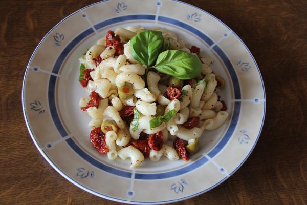 TĚSTOVINOVÝ SALÁT SE SUŠENÝMI RAJČATY, OLIVAMI A ČERSTVOU BAZALKOU 😉