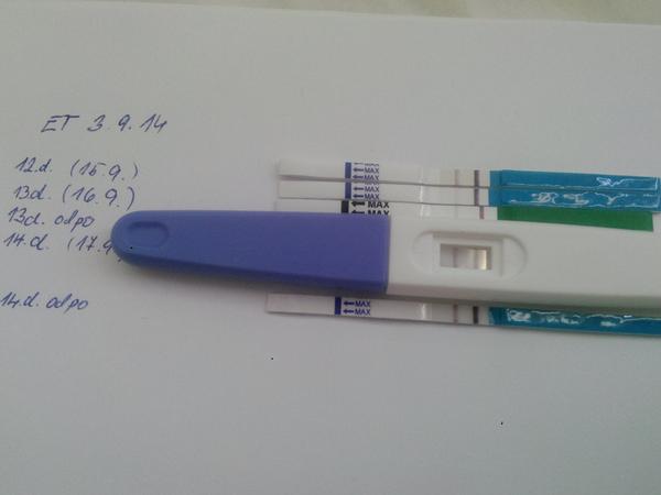 Ahoj holky, tak jsem Vás dočetla. Uf. Řeknu vám, nechtělo se mi sem včera přidávat špatné zprávy (občas sem tedy nakoukla). V pondělí (12. den od ET) jsem měla pěknou čárku, jak jsem psala. Když jsem si dělala test v úterý ráno, tak už čárka byla o dost slabší. Říkala jsem si, jestli jsem neměla třeba jen hodně zředěnou moč. Došla jsem si koupit nový test (ale nemáme tu dr. Max), tak jsem testovala jiným a čárka opět hodně slabá. Dost mě to rozhodilo. Dneska ráno už jsem si dělala ten Genneťácký test a čárka zesílela. I teď odpoledne už se mi zdá silnější, než ta pondělní. Tak snad.... Dnes po 15. hod. mám volat na výsledky krve.