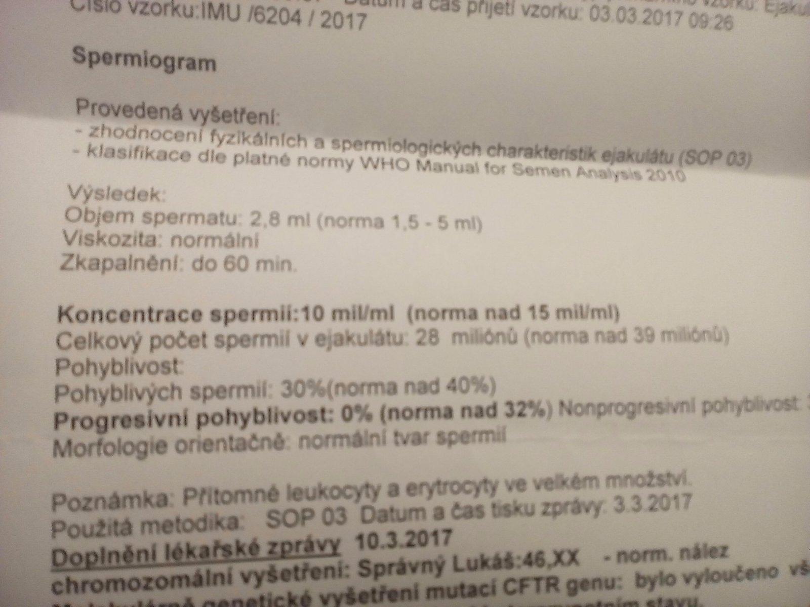 @sonisek jste jen trochu pod normou, ta je 15 mil/ml, jinak my máme hodně špatný spermiogram, cca 300 tis./ml