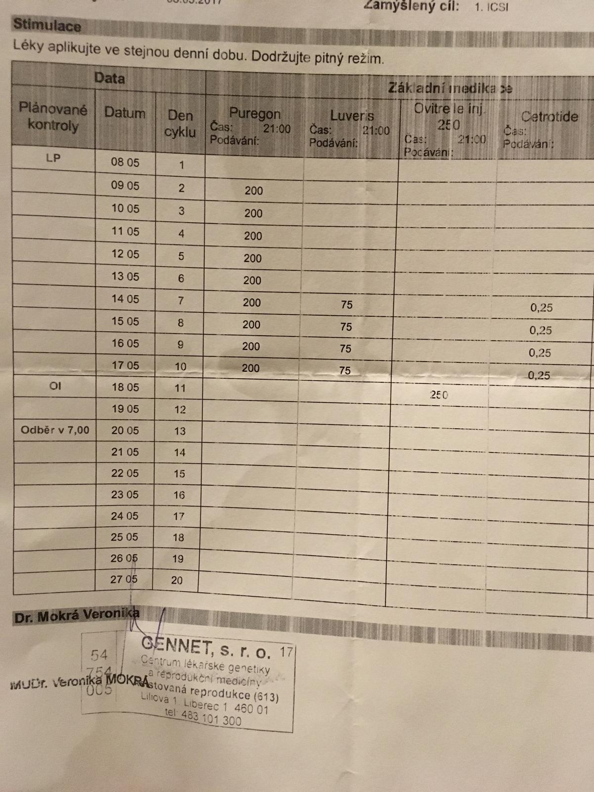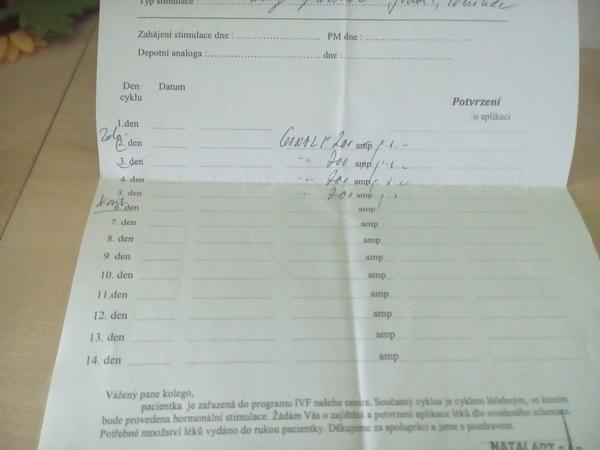 Jo a strany taky stridam i rozpis mam. Doktor mi to vzdy updatuje jak tam jdu. Mam tam zapisy i hladin hormonu z krve a pocty folikulu a co si mam ten den aplikovat a i den a cas dalsi kontroly.