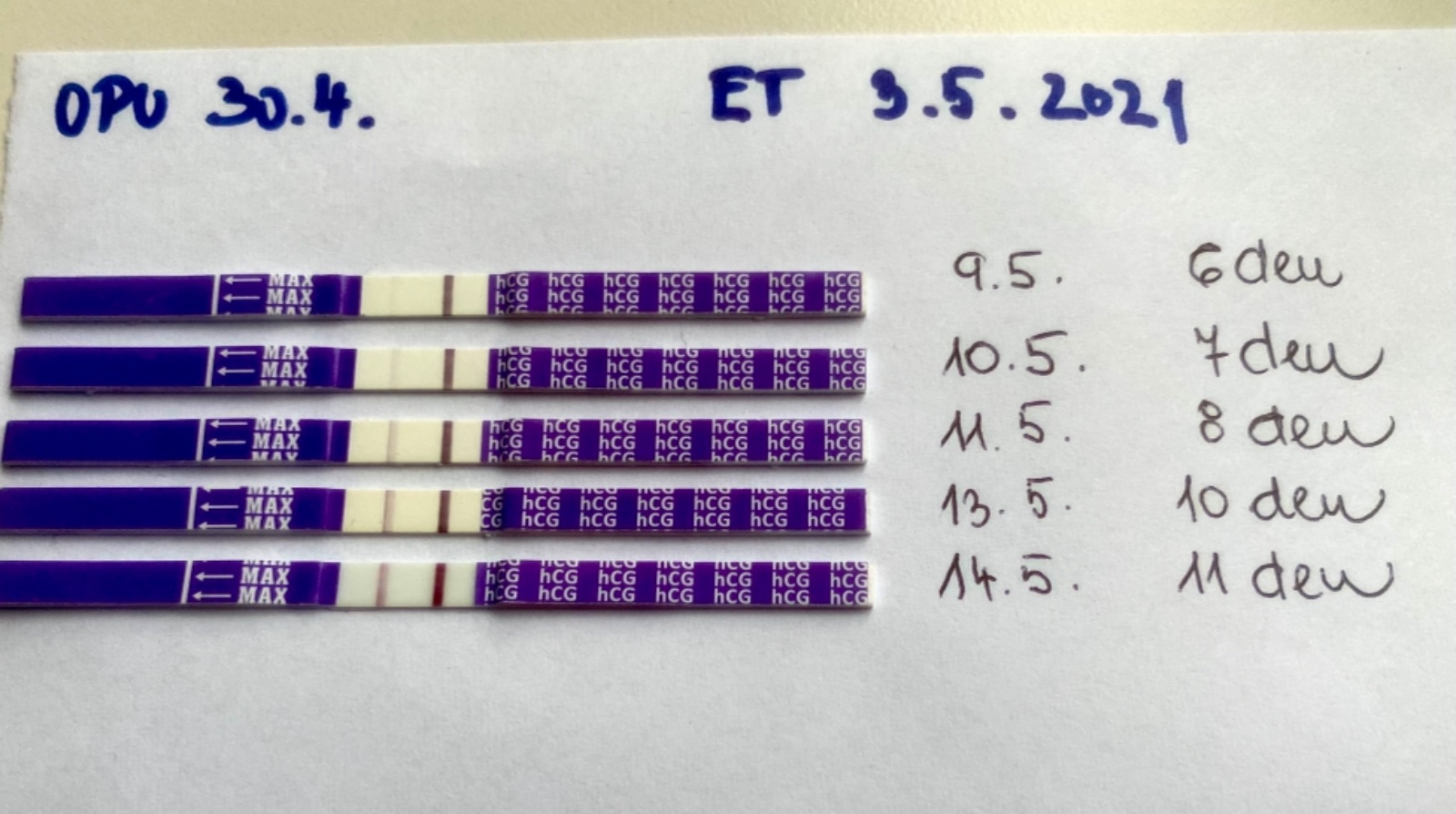 Ahoj holky.Je tu někdo kdo má v květnu KET?Já byla 5.5 ,vložen jeden 5ti denní mrazáček.Předevčírem jsem zkusila TT.Prikladam fotku.Koukala jsem jak blázen, že 6 den po KET už byl duch,tak se modlím ať je vše v pořádku. Ovitrelle jsem pichala 28.4 ,tak to už by snad nemělo mít vliv.Jinak beru Godasal,medrol,gynprodyl a jednou za tři dny agolutin.