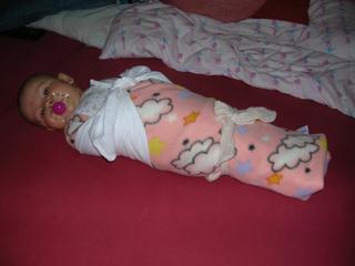 @pantomima, do zavinovačky se nám malej nevejde, tak zavinuju do pleny, jak nás to učili v porodnici. Z toho se ale dostane. Už má sílu. Zkusím ještě tu deku. Přece je jenom silnější...
