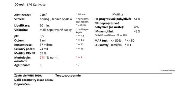 já si spíše myslím že partner má menší podíl spermií, manžel má 47 let vzhledem k veku už má také vady už spermií většinou vady hlavičky....ale má celkový počet spermií má 480 milionů, takže v t důsledky i když má už jen 1% normálnícg spermii tak ze 480 milionů je to pořad hodně....tvůj pratner má pouze 74 milionu a pouze 2 % mrfologick\ normálních..otěhotnění je určitě možné, jen to třeba déle potrvá