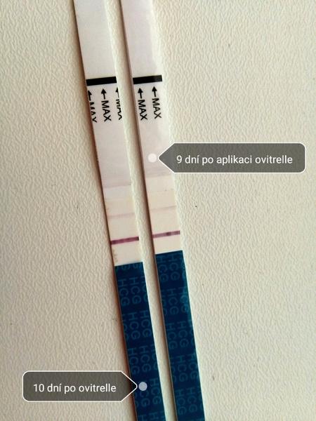 Holky, tak přispěji i já, třeba to někomu v něčem pomůže. Aplikace ovitrelle byla 01.06. ve čtvrtek ráno v 9 hodin. Dnes jsem 10 dní po aplikaci. Přikládám foto testu včera a dnes. Ovitrelle se mi odbourává pomaleji, než jsem čekala. Jo a k negativním vedlejším projevům : bolí mě prsa po stranách, mam citlivé bradavky a bolí mě podbrisek, ale ne tak, jak píše většina holek ( nepicha mě v něm) ale bolí celkově, řekla bych tlaková bolest...