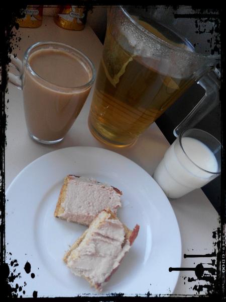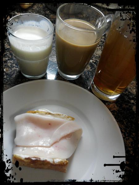 Snidane - konev zeleneho caje, kava s mlekem, mleko a pecivo s tunak.pomazankou 🙂