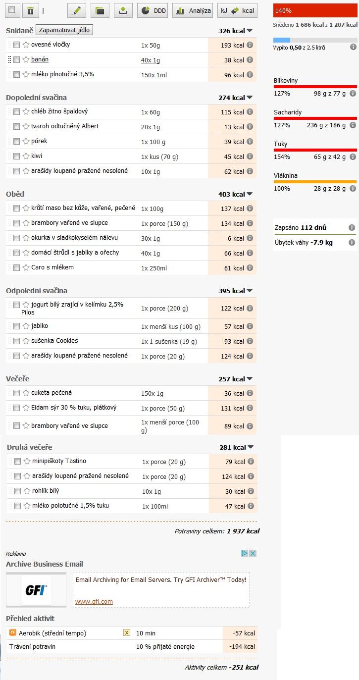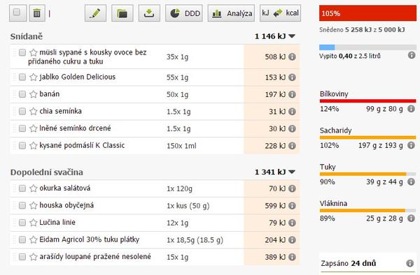 Já bych ty bílkoviny taky moc nepřesahovala, je to zátěž na ledviny a játra. Ale jsi dobrá, že přesahuješ bíkoviny, tam mám problém se vůbec dostat nad 90%. Mě to ale počítá 1,8 g bílkoviny na gram váhy, což nevím jestli není zbytečně moc..