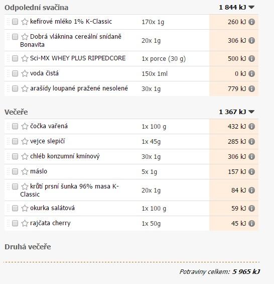 Ha, dneska jsem měla větší oběd než jsem měla v plánu, ale měla jsem po práci na zahradě příšerný hlad. Cvičně jsem si dneska vzala i sporttester a byla jsem překvapená kolik kalorií jsem za ty dvě hoďky spálila - asi tam budu fakt pracovat častěji a dobrovolně 😀 😀. Takže mám jen víc bílkovin, což by neměla být taková tragédie a to si jdu ještě odcvičit Jill.......