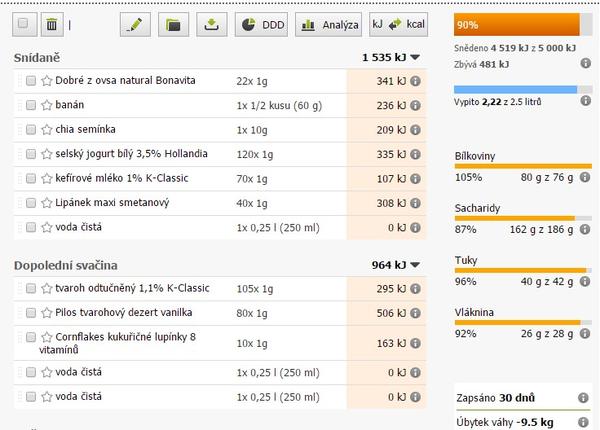 a můj dnešní- dnes jsem zapisovala i pití - odpoledne jsem nebyla doma - kdybych byla, tak mám minimálně o sklenici vody víc (spíš o 2) .