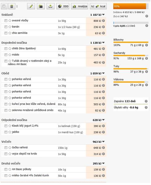 Tak jsem to zapsala, jeste jsem zapomnela na pet piskotu a mliko vecer... a nemam uplne presne zvazeny obed, nevedela jsem jak ho zvazit, uz to bylo smichane. Takhle mi to vychazi, ze jsem mela malo, ale odhaduju, ze ten obed mohl byt o trosicku vic, nevim,. to je fuk, hlavne, ze je to celkem vyrovnane... Jinak teda mam o pul kila vic nez pred tydnem, ale rekla bycgh, ze to tak porad kolisa a pak najednou to klesa, zase se drzi nebo kolisa a zase pak klesne, ale az za delsi obdobi. Jo a zjistila jsem, ze maji chybu v pohance varene. Jeste pred tydnem to meli spravne, pak asi nekdo neco upravoval a neda se tam vubec zadat. Haze to nejaka strasne vysoka cisla, maji tam o nulu vic ve vypoctu (misto desitek to pocita stovky...) tak jsem musela kopirovat z minuleho tydne slozite...