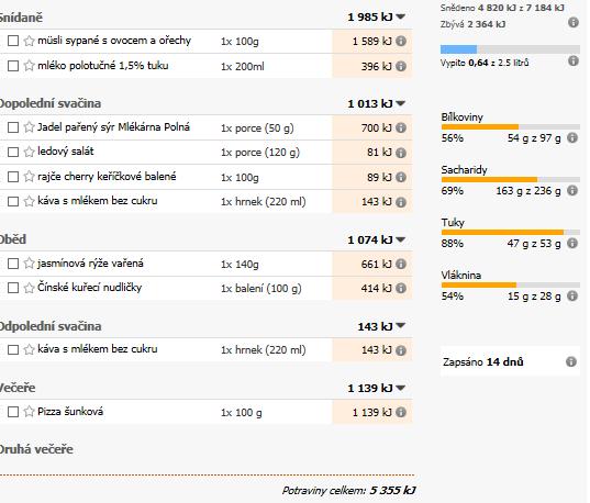 Pro představu přikládám svůj dnešní jídelníček, je to teda 8200 kj, zatím nevím, jak tam těch 9000 nacpu🙂