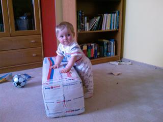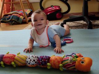 no a áš malý už zas postupuje dalej už dvíha zadoček do hora a vystiera nohy a už sa mu aj párkrát podarilo že si ich podsunul pod seba ale obe naraz a nevedel že aj ruky majú isť dopredu tak rovno ústočkami na žinenku 😀 😀 😀 ale bol podarený ako sa snaží ísť dopredu a nie plaziť sa dozadu 😀 😀 😀