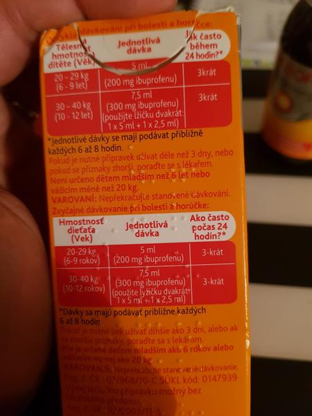 @ahojcau ten nurofen má na krabičce výpočet na kg tělesné hmotnosti s minimální dávkou ibuprofenu, tj. 20 mg / kg hmotnosti/ den. Maximum je 30 mg na kg za den. 5 ml nurofenu je málo, potřebuje 10 ml.