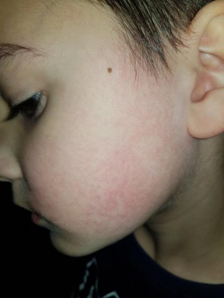 Ahoj..syna ( 7let) dnes ve skole pry bolela hlava a byla mu zima ze ho uvolnili z jedne hodiny a nechali ho lezet ve druzine...kdyz jsme sli ze skoly tak byl v pohode..a tedka jsem si vsimla ze ma cervenou vyrazku na tvarich...pak.pa osypane cele telo...na brise a zadech nacervenale pupinky a na rukou a nohou takove jakoby vystouple pupinky ald v barve kuze...teplotu nema nesvedi ho to..co to muze byt ?