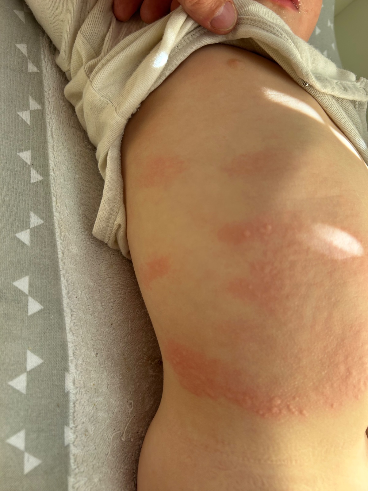 Alergická reakce - mizení a objevování na jiném místě v řádu i několika dnů je pro ni typické. Dcera to naposledy měla po šťávě z kiwi (ani ho nesnědla, jen do toho sáhla).