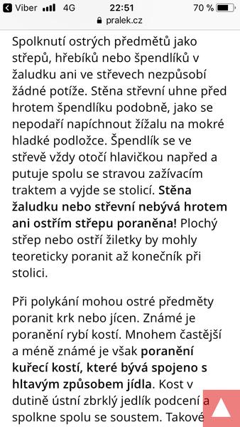 Dobry den. Syn minulou nedeli snedl kousek hrotu vydlicky s hranolkama. Byli jsme.v zoo a manzel.si.najednou vsiml ze syn.ma.kousek.hrotu v puse. Rychle.mu to napichovatko vzal a vsiml.si ze ze tri hroty chybi dva. Jeden vyndal ale ten druhy musel snist. Syn v poradku. Dvakrat jsem.prohledala hovinka a noc.byl to maly kousek asi 1 cm max a cerny.takze jsem.mohla.preklednout.syn ma tvrdsi bobky... to se stalo.minulou nedeli ( pred pred 11 dny ) předevčírem a vcera v noci spatne spinkal a chvilkama.rikal bebi. Myslite ze to.muze byt ten.kousek? Ze se to az ted projevuje? Pres den.je naprosto v klidu. Znama rikala ze to nemam.resit ze to v klidu projde ze se to obali tak jsem to s dr.nekonzultovala ale.ted si to zacinam vycitat ☹