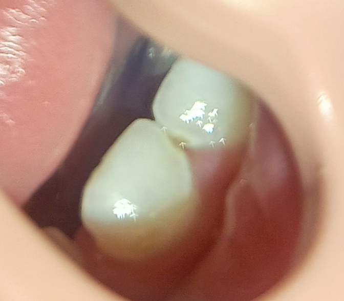 Zajdi si k zubaři, může to být mezizubní kaz, ale také zubní kámen. Z rozmazané fotky to nikdo nepozná.
