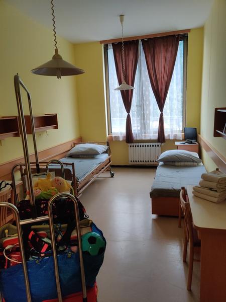 My jsme byli v Janských Lázních se synem na podzim. Jsou mu teda už 4, ale na základní věci, ti snad odpovím. My měli standardní pokoj, pokoje na doplacení už neměli volné, když jsme řešili a hlavně asi 24k se mi do toho dávat nechtělo. Standardní pokoj byl jednoduše zařízený, skříň, dva stoly, židle, postele, noční stolky. Lednice a televize za příplatek.(Mám fotku jen když jsme přijeli). Sociálka na patře, asi pro 8-10 pokojů...nikdy se nestalo, že by byli špinavé, paní uklízečka chodila několikrát denně. Ve sprše jsme se vždy vystřídali, nikdy jsme nečekali. Na každém patře je sestřička, kdyby se cokoliv dělo. Manžel dojet může, pokud není nějaká izolace a domluvíte se,.může s vámi spát na pokoji. Já bych teda spíš doporučila, aby si zaplatil ubytování někde v okolí, vyjde to cenově stejně a bude to mít pohodlnější a lepší jídlo 😁. Jedna noc stála asi 700 a na snídani dostal paštiku a krajíc chleba 😁.