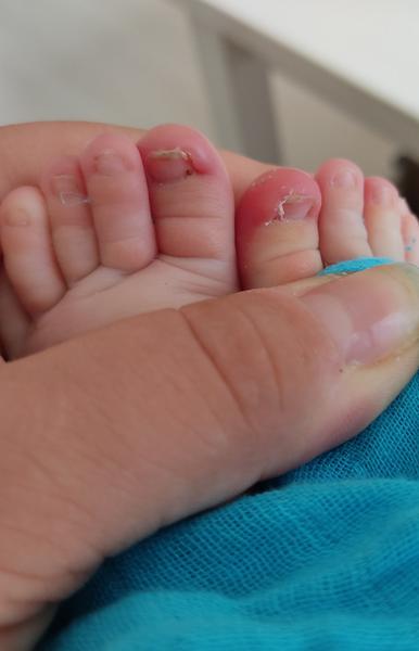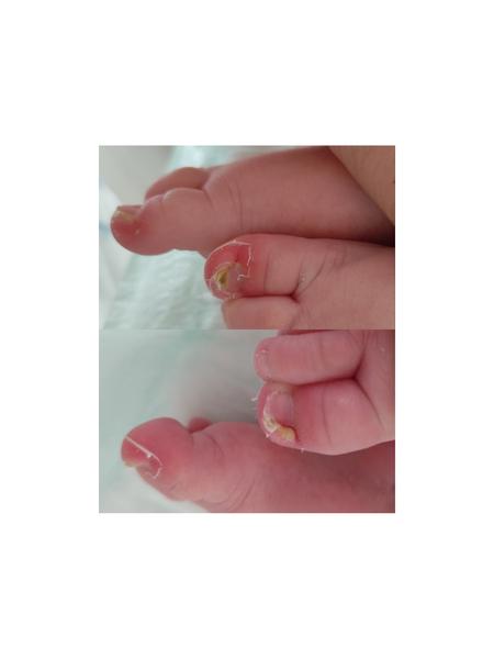 Mám dvojčátka. Oběma zarůstaly nehty (4tyden) Nikam jsem s nimi neletěla. Trochu jsem sázela na selský rozum. Desinfikovanymi nůžkami jsem jim ten hnis odstřihla a sem tam stříkla bezalkoholovou desinfekcí. Zasílám foto pro představu. Ještě to není úplně ono, ale o 100% lepší jak předtím. Rozdíl týden.