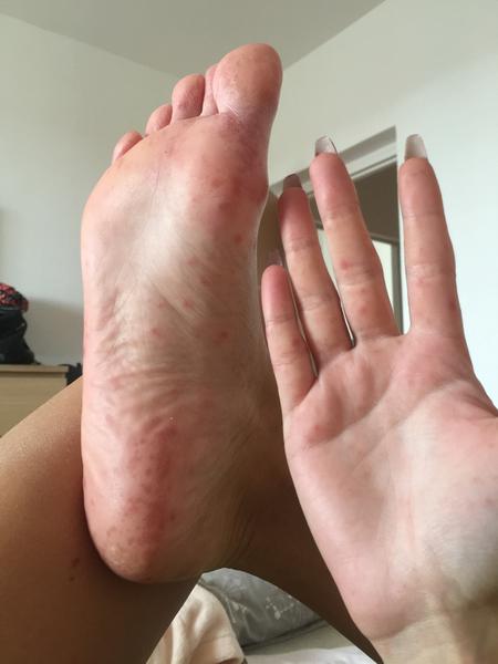 Tuhle nemoc zrovna prodělávám, začlo to minulý čtvrtek teplotou a svalovou horečkou, kterou jsem klasicky srazila Paralenem (zajímavé je, že trvala přesně na minutu 24hodin) a poté nastalo jednodenní bolení v krku. Druhý den bylo vše OK, ale začaly mě večer hrozně bolet nohy a začalo mi v nich brnět. Myslela jsem že to mám z nových bot, nějaká alergie na lepidlo nebo látku. Nechala jsem to být. Pak ale vyskákaly takové flíčky i na dlaních a hrozně se mi osypala pusa - kolem rtů, myslela jsem že to je jen z pocení nebo z toho jak se člověk otírá. Další den jsem se nemohla ani postavit, nohy mě pálely jako kdybych měla nohy v ohni, ruce to samé, do toho to svědělo a štípalo, nedokázala jsem napnout nohu, nohy jsem chladila v ledové vodě asi 4 hodiny - v noci - protože jsem nemohla ani spát. Při chlazení jsem narazila na tuto diskuzi, mimča to mají teda o dost méně než já, měla jsem ty chodidla až do fialova (viz foto) a ruce celkem OK. V neděli jsem letěla na pohotovost, nemohla jsem absolutně fungovat, tam jsem mimo jine čekala 3 hodiny na neschopného doktora, který mi po třech hodinách předepsal obyčejný Paralen. Dnes je sobota (další týden) ruce vysychají, nohy taky, kolem pusy vše zmizlo. Zjistila jsem, že na fázi „vysychání“ pomáhá kokosový olej. Teď se na některých místech objevují i takové vodnaté puchýře, a jen doufám a modlím se, že mi z toho neslezou nehty, protože ty puchýře jsou jen kolem palců a na malíčcích na noze.