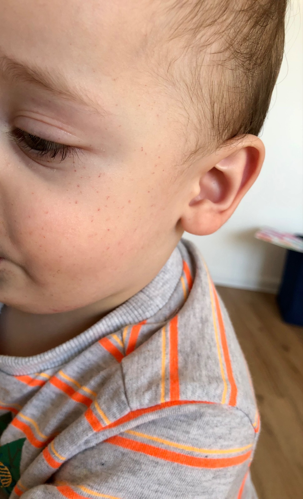 @marta_kovar prvne zkus sklenickovy test-priloz na vyrazku sklenicku a pokud se vyrazka ztrati pod tlakem sklenicky,tak se vylouci meningok (to je jen pro jistotu), mne to spis prijdou jako pihy? Nebo klidne muze mit od rustu zubu,pokud treba byla horka tvar..