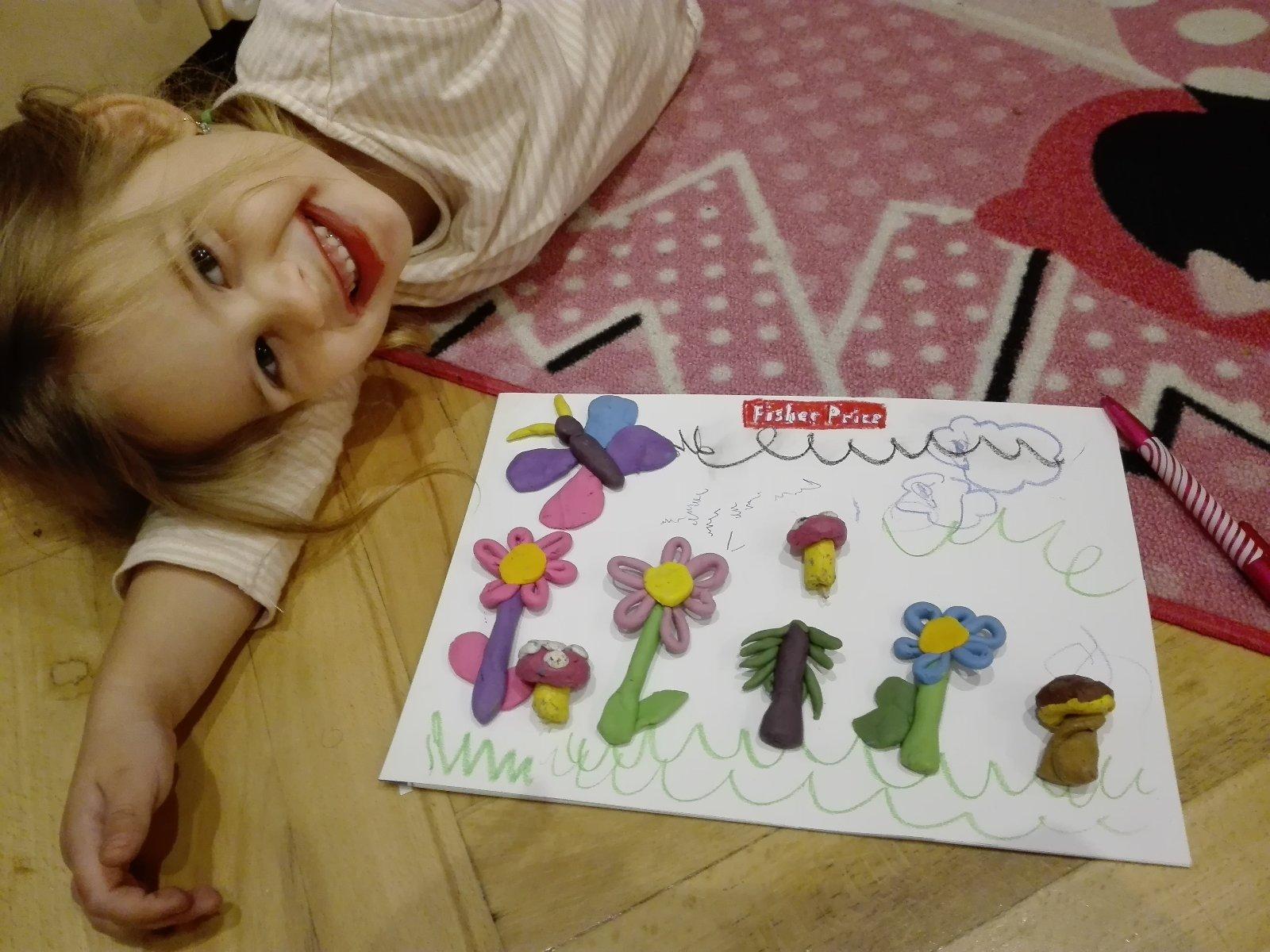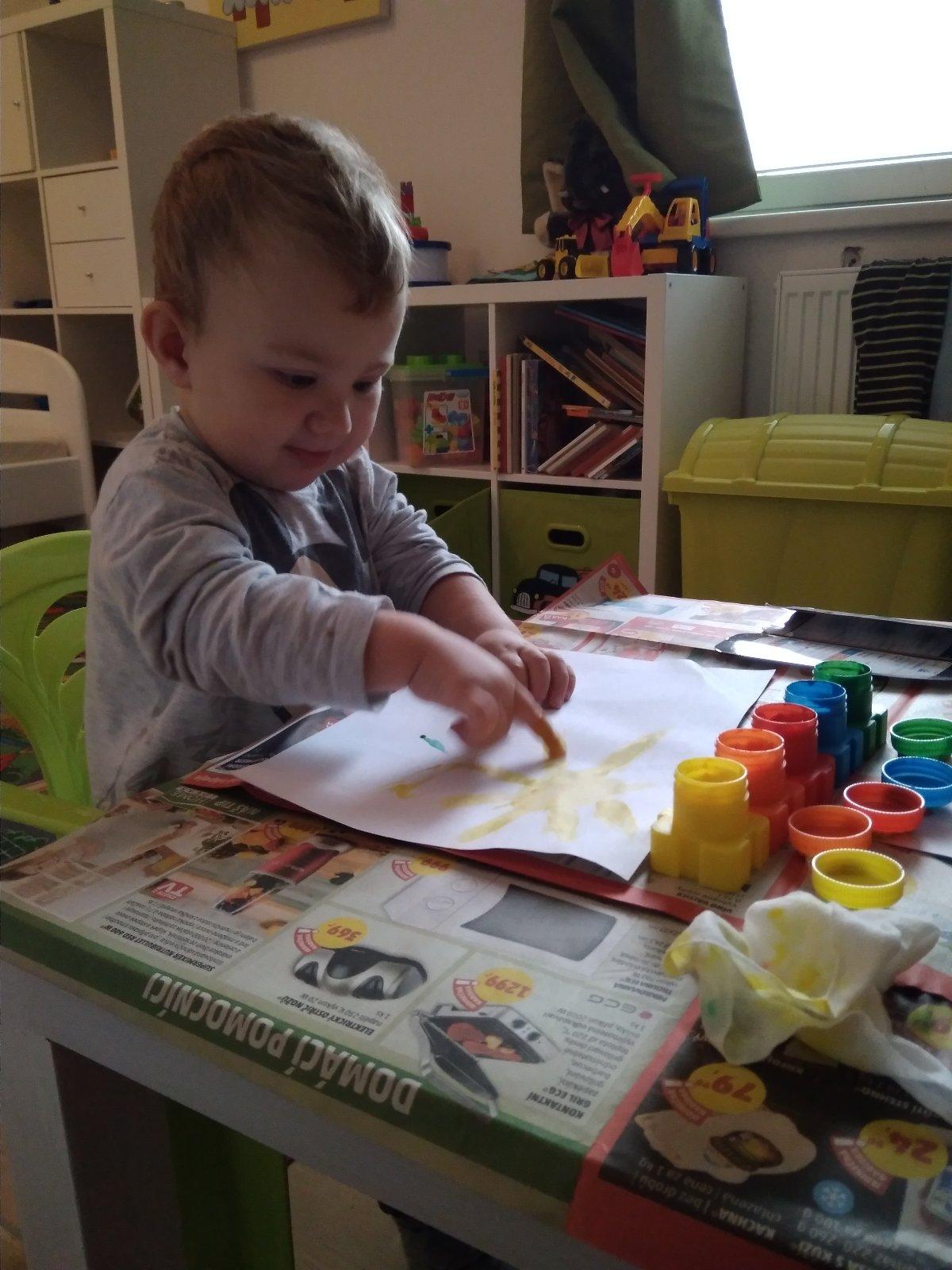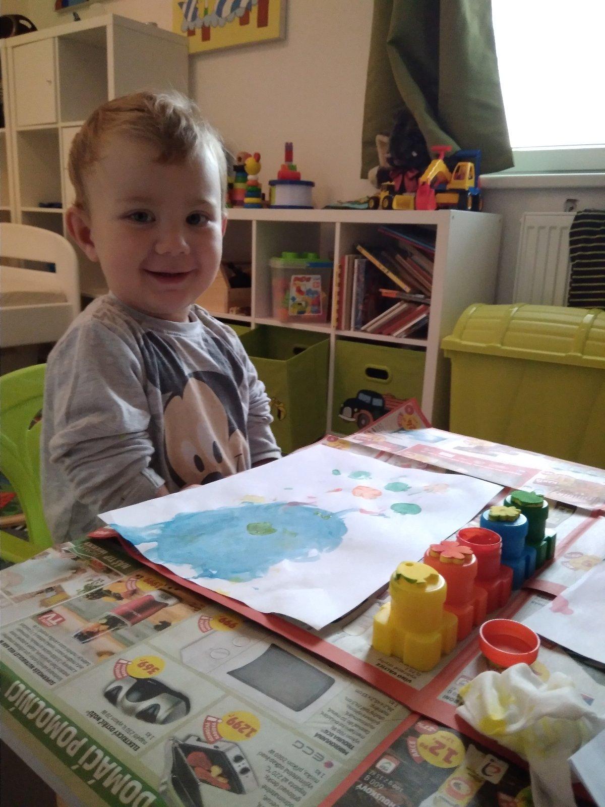Tak jsme se po probuzení pokusili také udělat naši zahradu smíchu. Nejdříve jsme jí museli namalovat, prstové barvy jsou idealni, a prý i dobre. A pak jsme zahrádku naplnili. Naše zahrada smíchu je plná kyticek a oblíbených pohádkových postavicek. A na závěr důležitý podpis spoluautora 😁 i úsměv se nám vykouzlil na tvářičce.