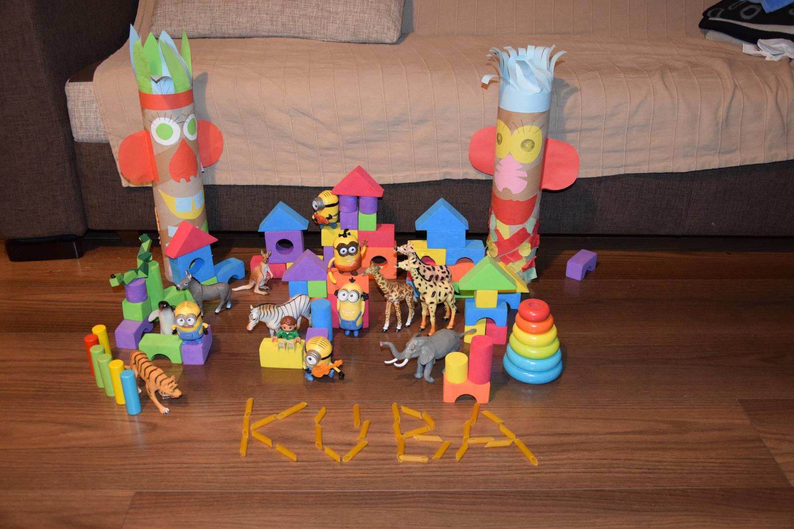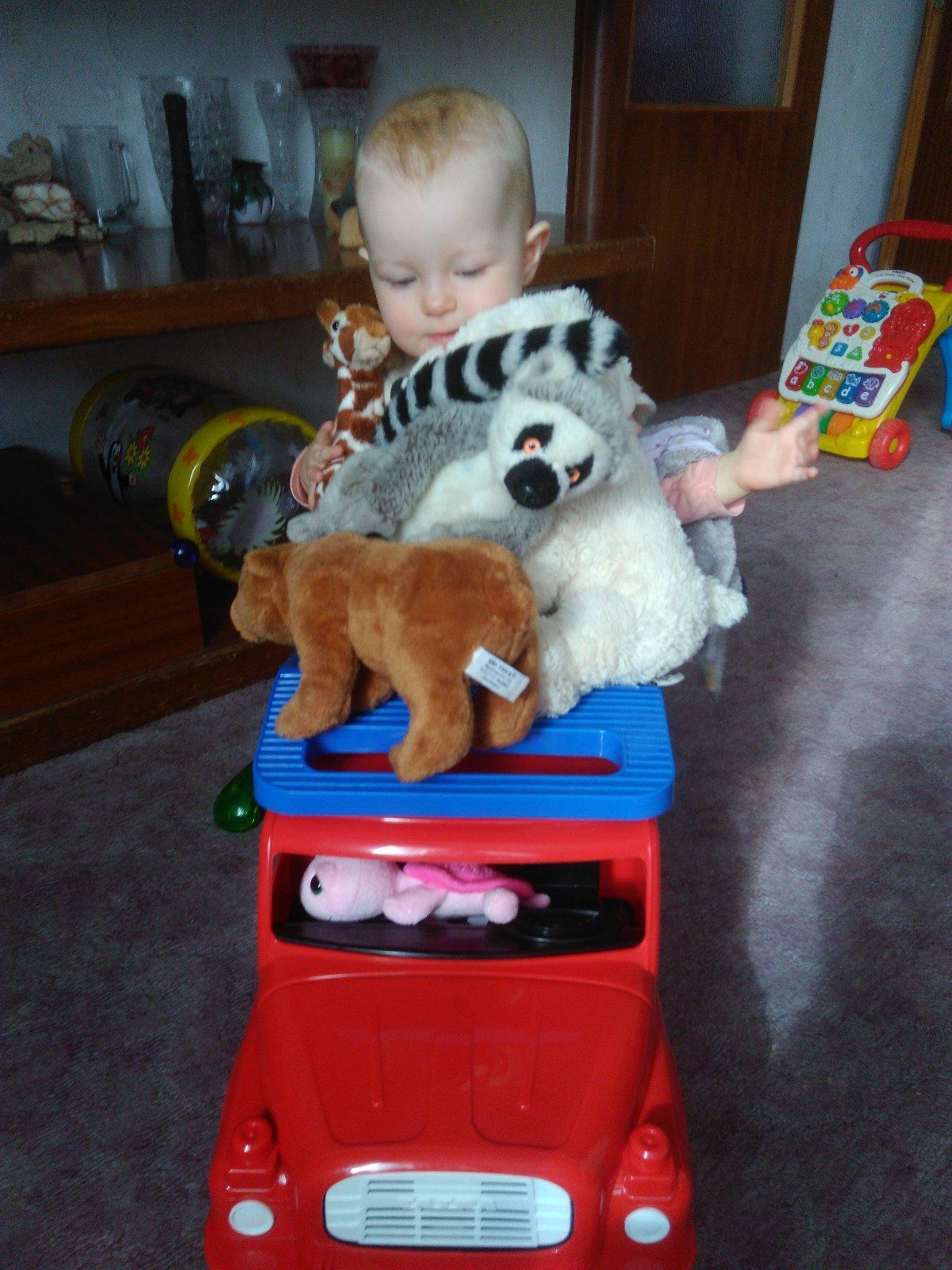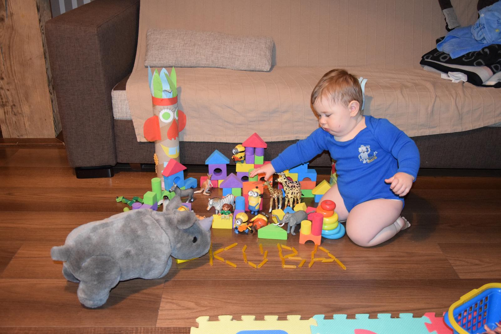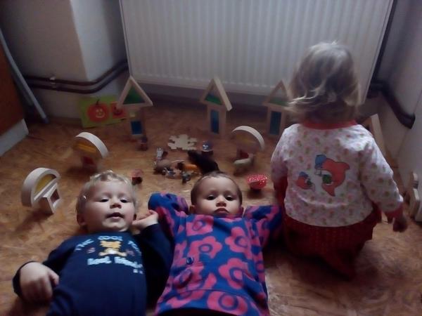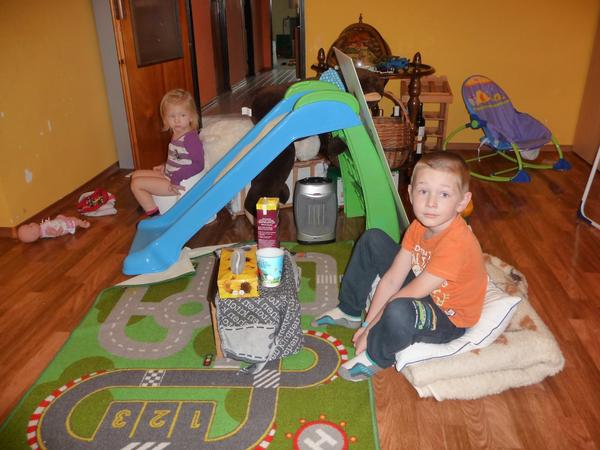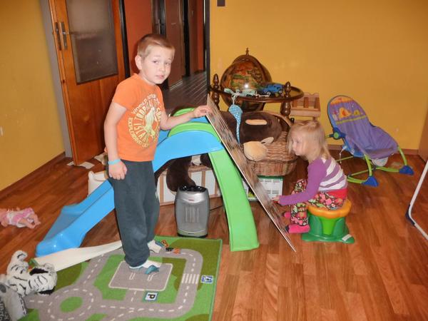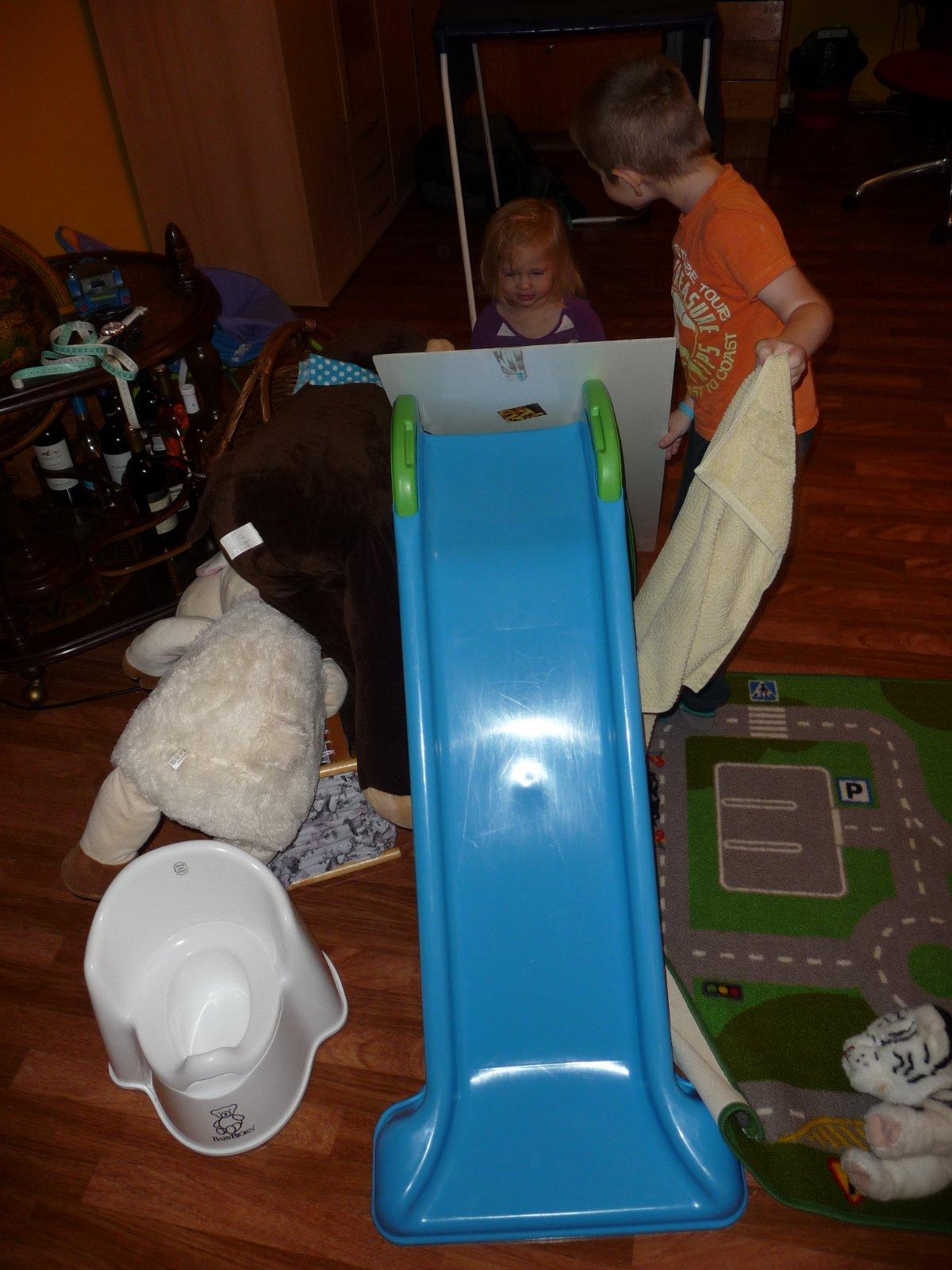 U nás už je tak trochu krizovka, obě děcka doma marod... takže jedeme různé filmy a pohádky a pro staršího doplňovací knížka... ale dnes se to zvrchlo ve velkovýstavbu zahrady smíchu a blbnutí, je to zcela multifunkční areál, kde lze poznávat zvířata a učit se poznávat nové, zároveň je tam ohniště, které zásobuje obývák teplem (rozuměj přímotop, který nemít, tak mrzneme, protože pan domácí nám netopí). Z druhé strany je kontejner z kamionu, ve kterém je dřvo (rozuměj par kostek) na zátop, pro odvod kouře máme i komín (=nočník). V zakoutí nesmí chybět klouzačka, která se rázem mění v horu, kousek dál je možno vidět kosatku Wiliho, jak skáče přes útes na svobodu za svou rodninou (rozuměj plyšová mega-opice a ovce = kosatky).
