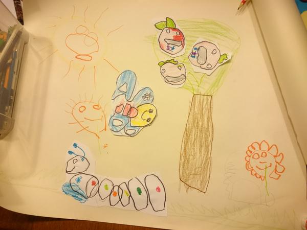 U nás už ke konci nebyla moc nálada na tvoření, takže se nám z obrázku "vypařil" šnek Fisher price, který měl být vedle kytičky vpravo.. Ale na stromě nám rostou Veselá jablíčka FP, ve vzduchu léta vkládací motýl a v trávě jsme objevili housenku Code a pillar. Všichni samozřejmě s úsměvem, i kytičky a sluníčko 🙂