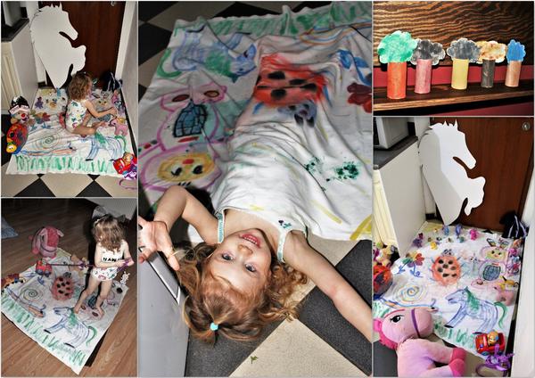 Nejdřív sem vystříhala stromky - malá by to fakt nedala z kartonu... Pak už přišla na řadu Nika a barvení - štětcem, houbičkou, prstem, loktem - barvy si vybírala sama, jak na listí tak na kmeny. Nutno napsat, že malá je milovnicí vody, proto naše zahrada smíchu s FP se nesla v duchu vody a patlání. Nechtělo se mi aranžovat hračky na deku, tak sme si vytvořili vlastní zahradu smíchu s FP. Hlavní postavy - sluníčko, koník, šnek, beruška, kytička se dvěma stonky a BeatBo. Jo a tráva :D ta nesmí chybět v žádné zahradě. Celý ten čas strávený s dcerou a chvíli i se synem (též se zapojil a maloval a patlal) byl to nejhezčí z celého dne. Smály jsme se, bavili jsem se u tvoření, šlapaly sme s Nikou po celé zahradě nohama, chvíli Nika koníka myla :D a musím říct, že tento druh zábavy u nás zařadím minimálně do doby, dokud budu mít staré ubrusy a prostěradla. Jako ženy, maminky, tatínci - uvolněte se prosím, přichází čas pro děti - ať si patlají, cákají, tvoří - jo je to pak mazec uklidit, ale to už děti spinkají takže směle do toho 🙂 Jinak perlička - malá byla pěkně vyčůraná - napatlala si barvu na prst a začala vždy chodit do umyvadla se mýt a tak to šlo asi dvacetrkár - prst do barvy a pak tři minuty rochnění si rukou v umyvadle. později se k tomu přidaly i nohy :D to bylo taky super - plavala celá koupelna a nikdo nepřišel k úrazu. K finální zahradě - prostě sme to nějak dohromady postavily, jenomže stromky tam Nika nechtěla - ty mají čestné místo na výstavce v obýváku - super jednoduché z ruličky a kartonu 🙂 Zapojil se i tatínek - Nika si vybrala koně a tatínek ji ho šel vyříznout - ten bílý opřený o zeď. Zahrada smíchu s Fisher-Price je totiž kompletní, když na ní jsou všichni koníci - má na ně velmi zvláštní oblibu 🙂
