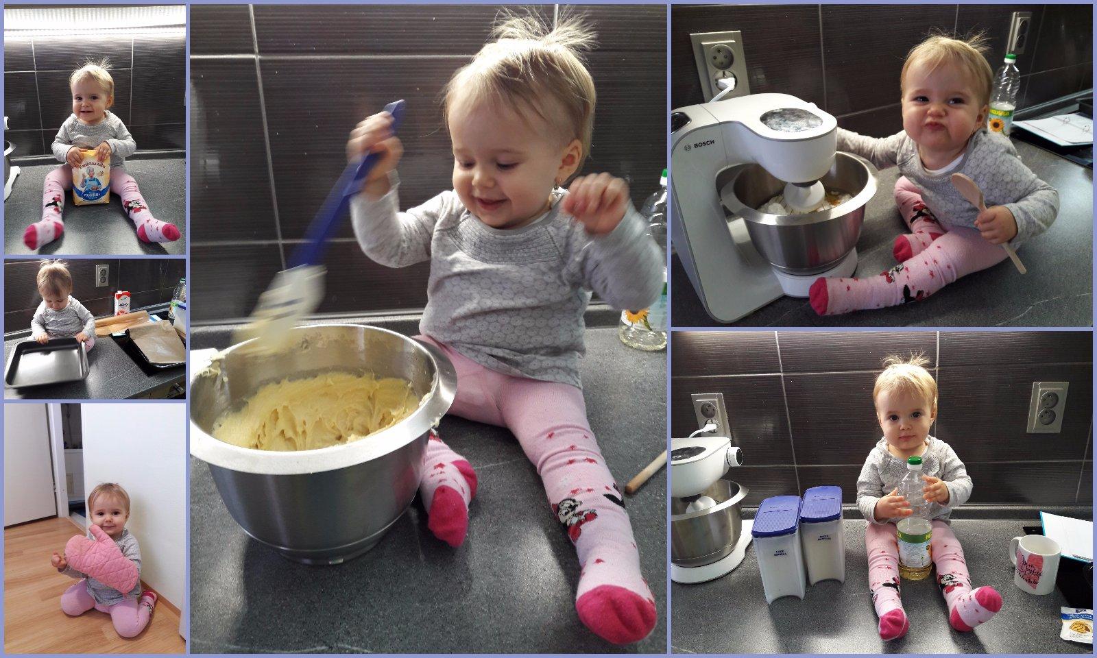 Madlenka jako správná pomocnice podávala všechny suroviny, míchala těsto (speciálně jsem jí kvůli tomu dneska koupila i malou vařečku 🙂 ), zapínala robota.. Ale co bylo překvapením i pro mě, největší radost měla ve chvíli, kdy chytla smetáček a začala uklízet ty drobky, které při focení nadělala 😀