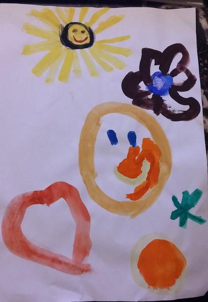 Tak tady je i náš výtvor - zahrada smíchu v podání našeho skoro tříleťáka Mirečka. Prý tam rozhodně nesmí chybět sluníčko, srdíčko a úsměv maminky 😍 Je to můj úžasňák šikovný o jeho kreativitě nemám pochyb, šla jsem pak kojit Malvínku jeho nejmladší sestřičku a delší chvíle ticha znamenala, že objevil razítka. Orazítkované máme doma teď skoro vše, jen Míru jsme už vykoupali 😀 , ale vypadal taky pěkně, a to jste neviděli zbytek jeho těla :D, zvládl se orazítkovat i pod oblečením.