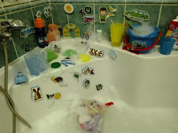 Už jsme tenhle týden malovali, skládali, lepili, stříhali - je třeba smýt tu pachuť pracovního týdne - takže vana volá! Hrajou si, neperou se, místo řevu zvonivý smích, pak umýt, vytáhnout špunt a rychle do župánků, zoubky, pyžamka a spinkat. A když se vrátíš do koupelny mělo by se mi chtít brečet, ale chce se mi smát - ano, je to tichý vnitřní smích s cuknutím v koutku - a hlavou mi bleskne - jsou moji, miluju je!