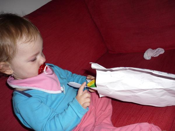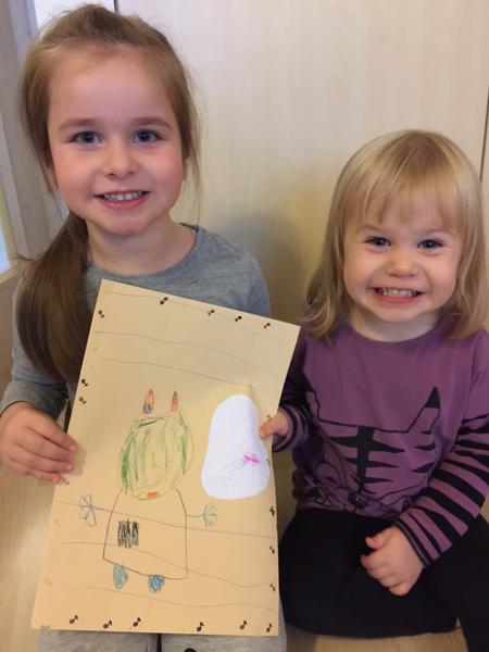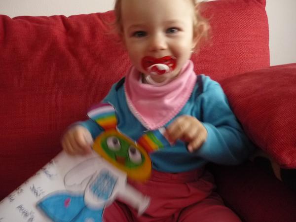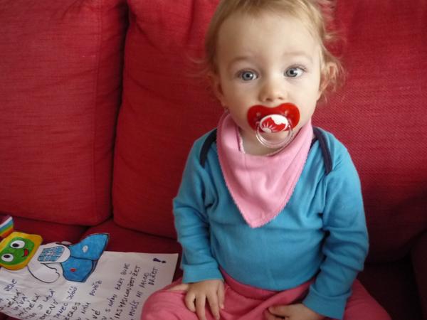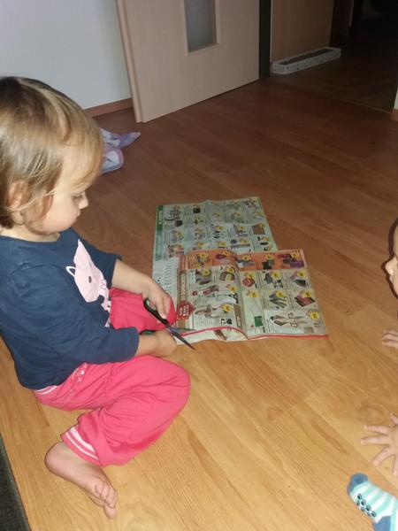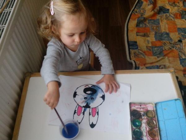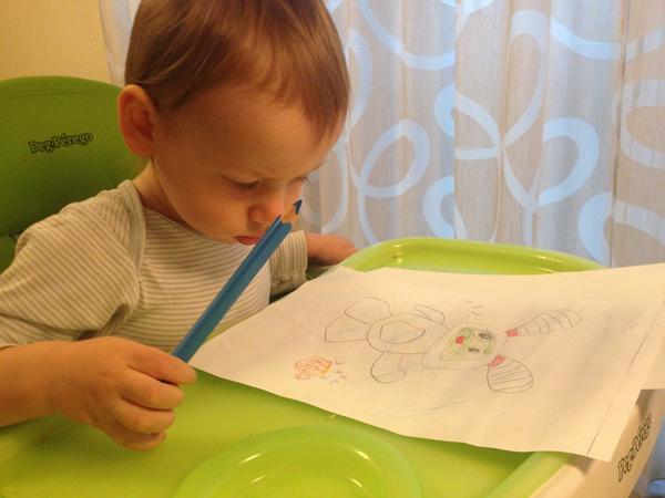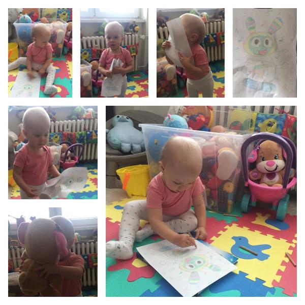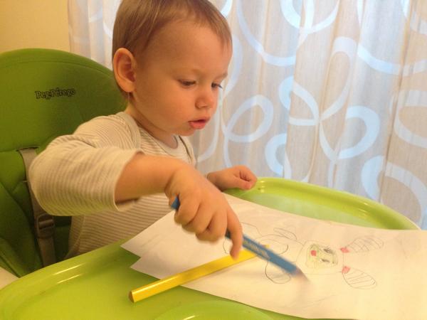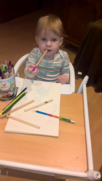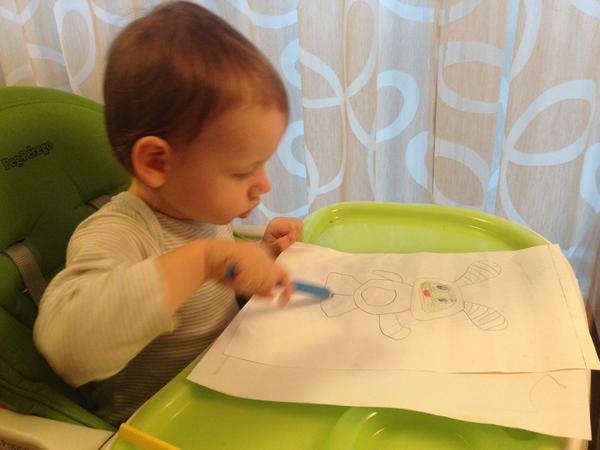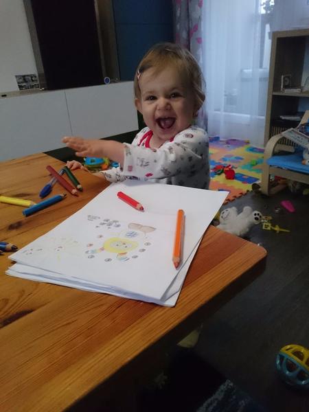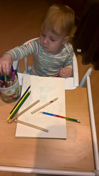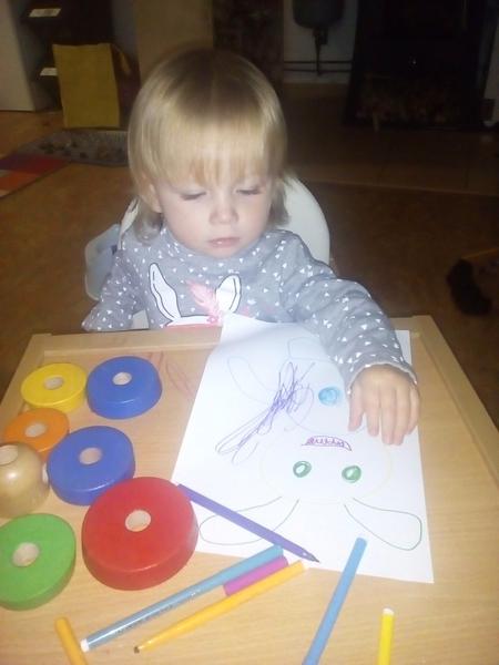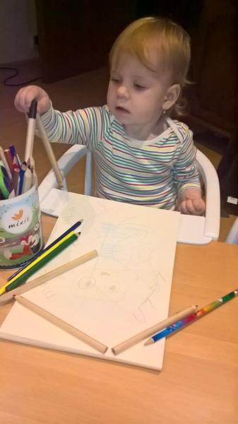 Nám je zatím jen 15 měsíců tak starší brácha načrtnul a malá pokreslila pastelkama ,které při tom stačila i ochutnat :D