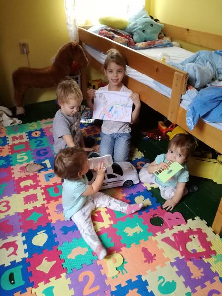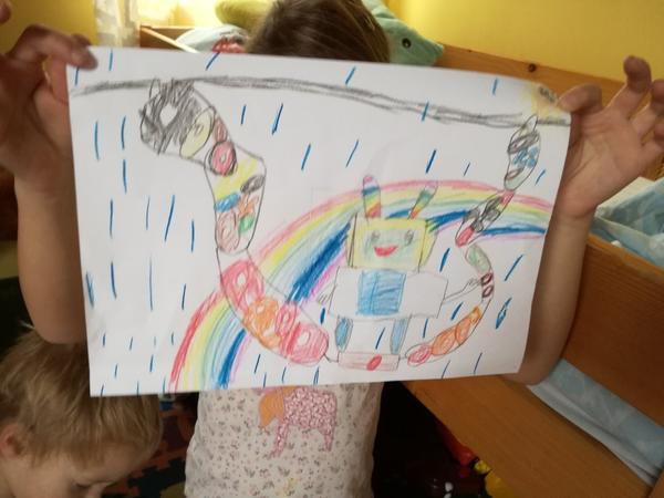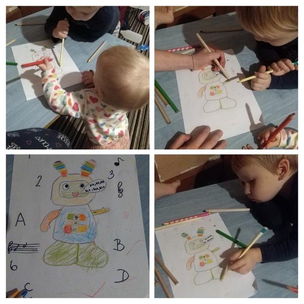 Nám by se takový šikovný kamarát také hodil, jak pro našeho syna 4 roky tak i pro naše roční dvojčátka. Obrázek jsme malovali skoro všichni, až na jedno z dvojčátek, to ještě spalo a pomohla nám i starší sestřička. A to je náš výtvor.